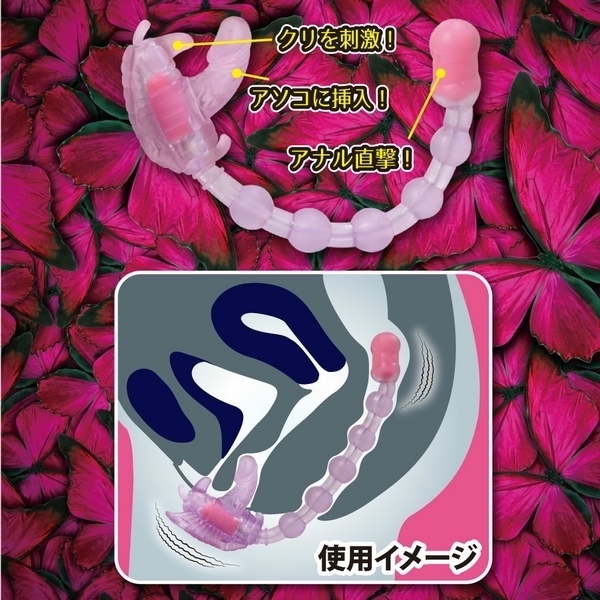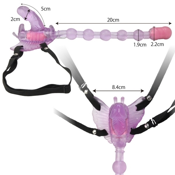 バタフライのディルド部とアナルビーズ先端にダブルモーターを搭載!ゴム製ベルトでしっかりと固定できるので、装着したまま外出すれば屋外プレイもお楽しみ頂けます。