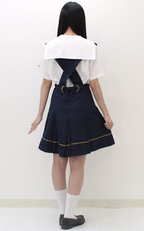 ブラウスの袖にロゴ、ライン入りジャンパースカートの後ろには、大きなリボンも付いています。