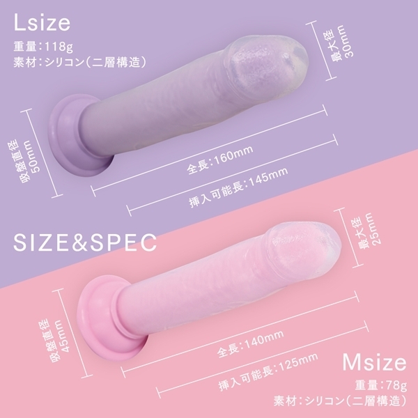 しっかり届くリアルな感触を追求したディルドタイプです♪全長約16cm、挿入可能長約14.5cmの満足感あるボリュームが魅力です!中には芯のある硬め素材を、外側にはぷにっと柔らかい層を採用した二層構造です♪リアルな手触りとしなやかさを両立し、自然なフィーリングを追求しています!吸盤付きなので、床や壁にしっかり固定でき、両手が使える安心設計です♪使用中のズレを気にせず、自分のスタイルで楽しめるのもポイントです!見た目はクリア×ピンクのかわいらしいカラーで、気分も明るくなります♪高品質なシリコン素材を使用しており、お手入れもしやすく清潔に保てます!適度な重みと安定感で、初心者から経験者まで幅広くおすすめです♪しっかりと深さを求める方にぴったりなLサイズ仕様です!快適なセルフケアタイムをサポートする、頼れる一本です♪