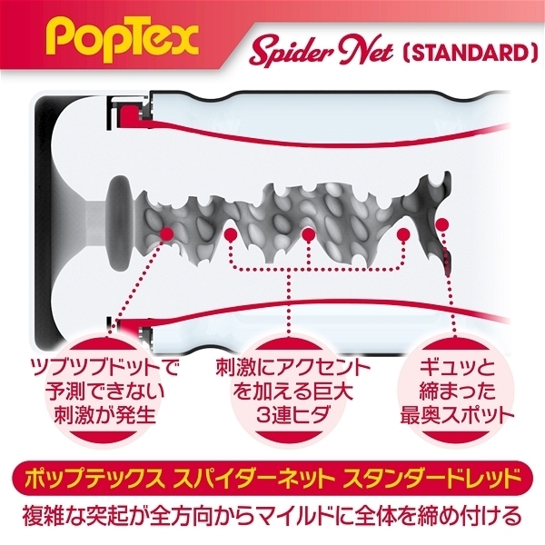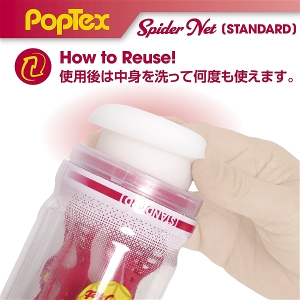 ポップテックススパイダーネットカップスタンダード<リアルな締め付け×ネットヒダ刺激の高機能カップホール>新開発SpiderNetTechnology搭載型カップホール!ホールを包み込む柔軟性に優れたシリコンネットで最も気持ち良い形状に自動的に変形することでスポンジでは再現できない自然なフィット感とリアルな締め付け感を実現しました!内部構造は網目状のネットヒダの中心にアクセントのイボ刺激のアクセント!強力に吸い付く最奥のバキュームスポットは天面の「OneWay」シールを剥がし空気を抜いて挿入することで内部のまとわりつき感をより楽しむことが出来ます。